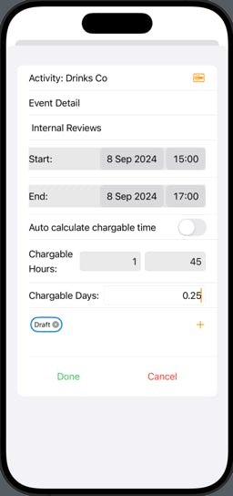 Events are assigned to activities. Enter a description and then select start and end times. Time It will automatically calculate the effort involved or you can manually select the amount of time you want to assign if all of that time has not been spent on actual work effort.
